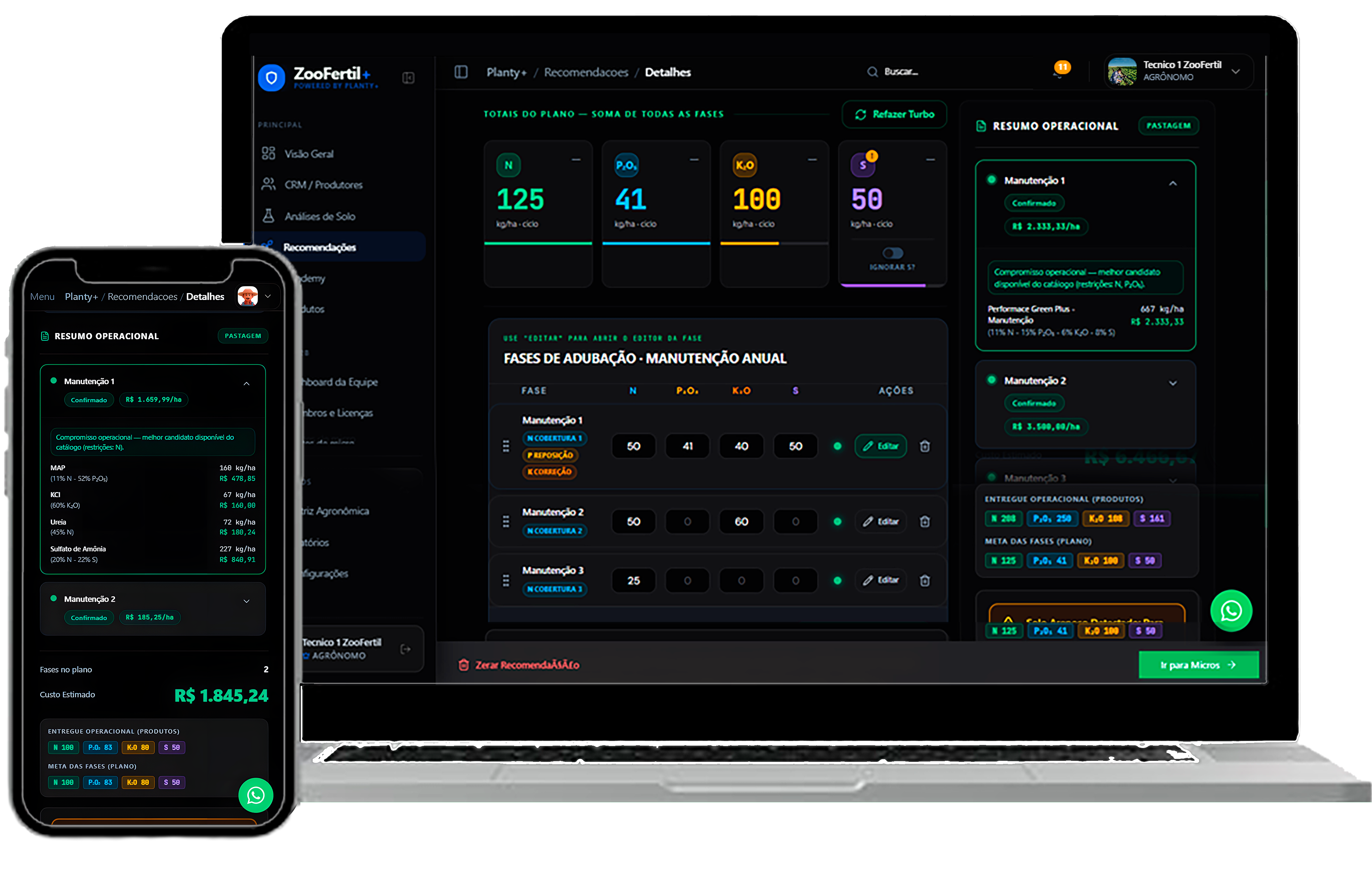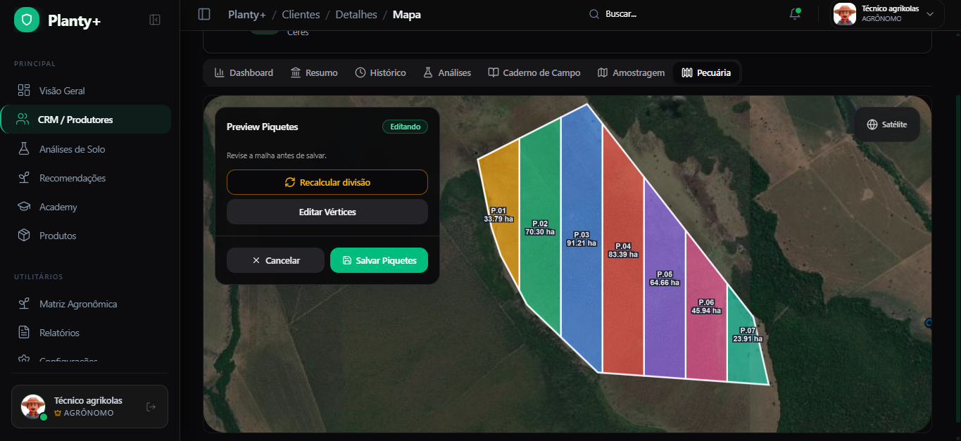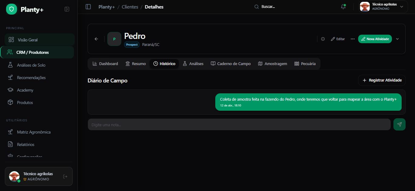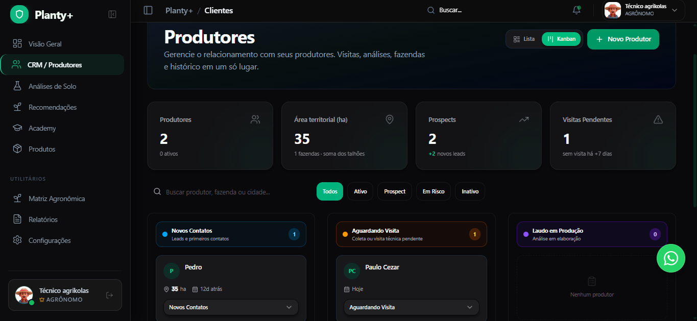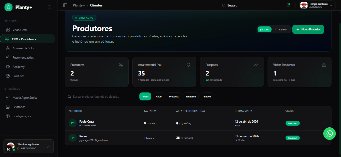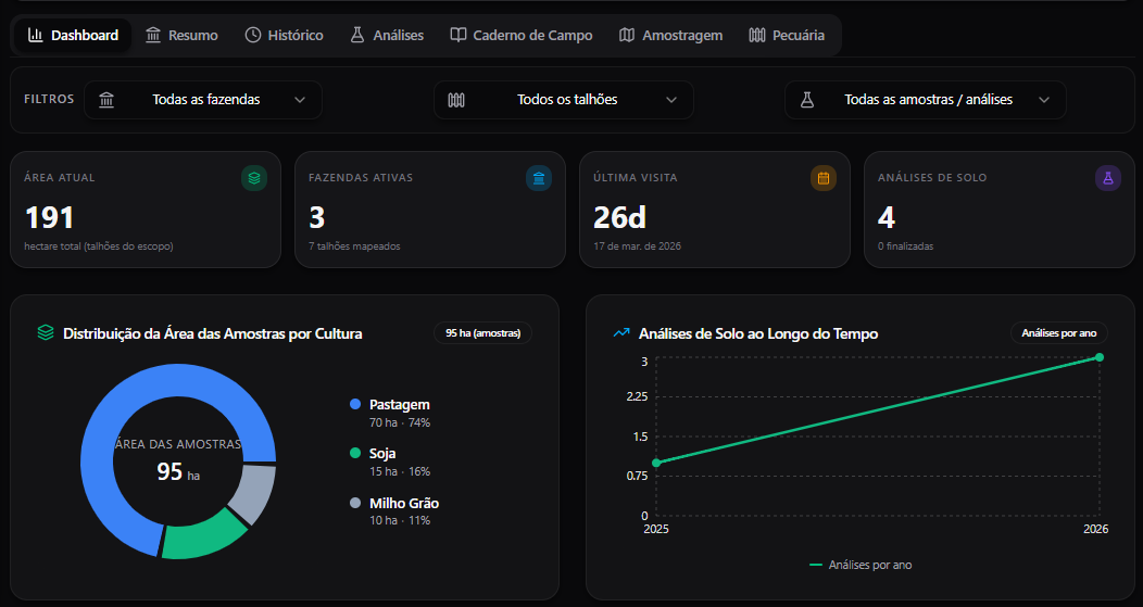 Dashboards, recomendações, CRM e campo conectados em uma experiência premium e visual.